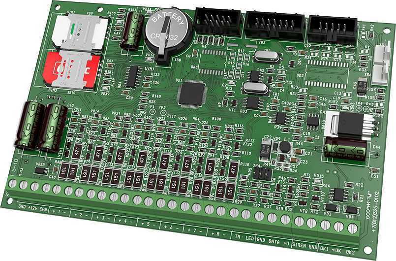 16 проводных шлейфов До 8 пожарных шлейфов 2 выхода для подключения исполнительных устройств и индикации 1 выход для подключения проводной сирены Интегрированный контроллер Touch memor |